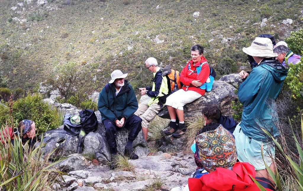 After lunch, we walked up Disa Gorge to the Aqueduct, down Smuts Track to the top of Skeleton Gorge, over the sandbank to Hely Hutchinson reservoir and the rusting, antique signpost near the dam wall. We then ignored its directions and walked past the Domisse Hit to the Jeep Track, and down Spilhaus Ravine to the Contour Path and Constantia Nek. En route the Leader gave a running commentary on all the various artefacts seen.