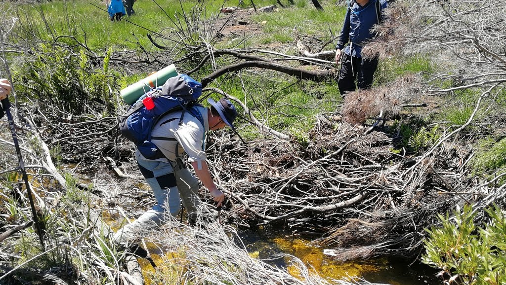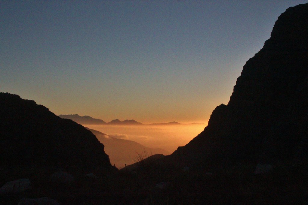 Our group comprised 14 members in total, eight camping in tents, three brave souls bivying and three day trippers who joined us for the hike as far as the Club’s ‘Springstygbeugel’ property boundary line. The first portion of the hike in the CapeNature area up to Springstygbeugel was on a clear path and so we made good time. From that point on we were off trail. We could have camped just inside the Springstygbeugel boundary, on the last level area of the valley next to the river. However it would have made a short first day and given the recent rains and availability of water Gavin had already decided we should camp up at the saddle. An excellent choice as it is an outstanding place to be able to spend the night.