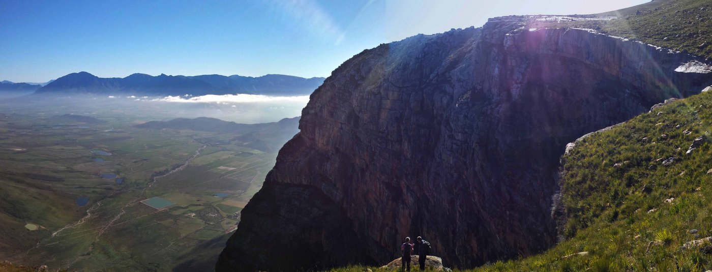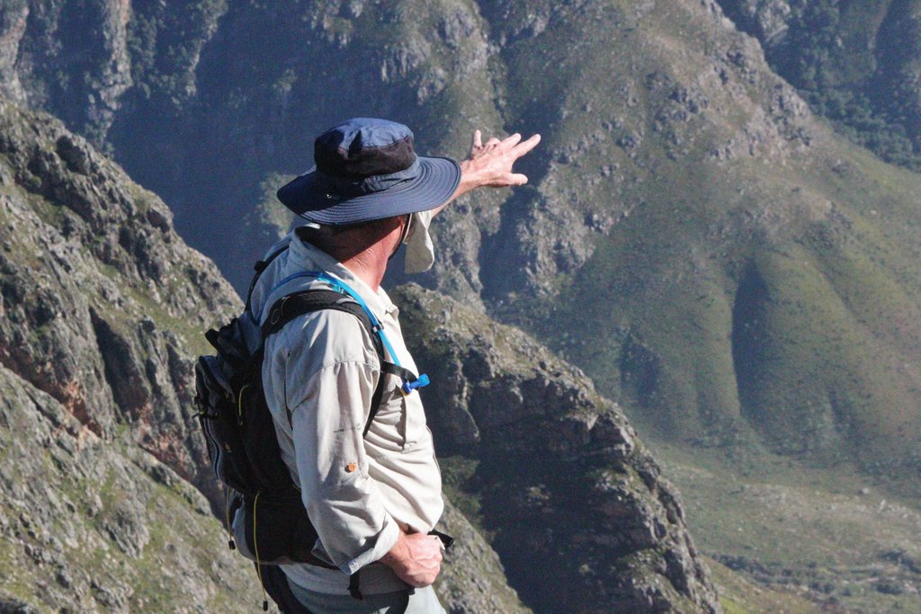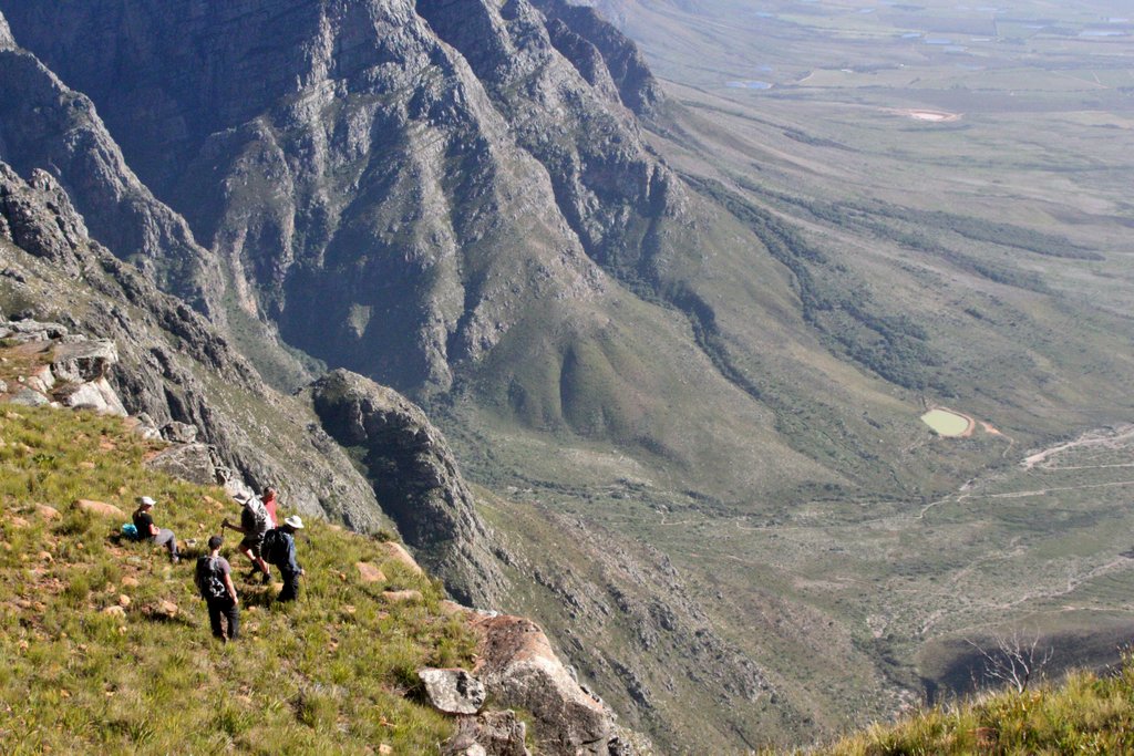 The wind died down in the evening and so it was pleasantly warm. I think most had a comfortable night and we were all ready to set off early(ish) on Sunday morning to find our way up via and above the rim of the Slanghoek Amphitheatre to the Peak. The early morning cloud in the Slanghoek valley cleared as we started our ascent, affording us great views in all directions and the water glistening off the amphitheatre cliffs was just magical. We were also blessed with a profusion of spring flowers which were eagerly photographed by some.