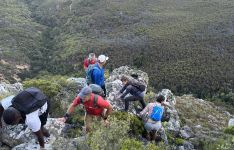 The Devil’s Tooth is a spectacular spire of rock adjoining Hutchinson Peak in the Banhoek Conservancy, near Stellenbosch. To ascend the summit cone, the first order of business is to reach the saddle between the Tooth and Hutchinson Peak. These days the Northern approach to the saddle is blocked off by various estates. The alternative Southern approach is a steep gully which comes up from Duiwelskloof. When I last did this gully four years ago, it seemed fine. However, when we did the recce of the route in December, it became clear that this gully has become very loose and unstable in places, and is now close to the edge of safety. Nevertheless, we successfully recced the route, without any significant incidents. So I decided to go ahead with the meet, but with a group limited in size.