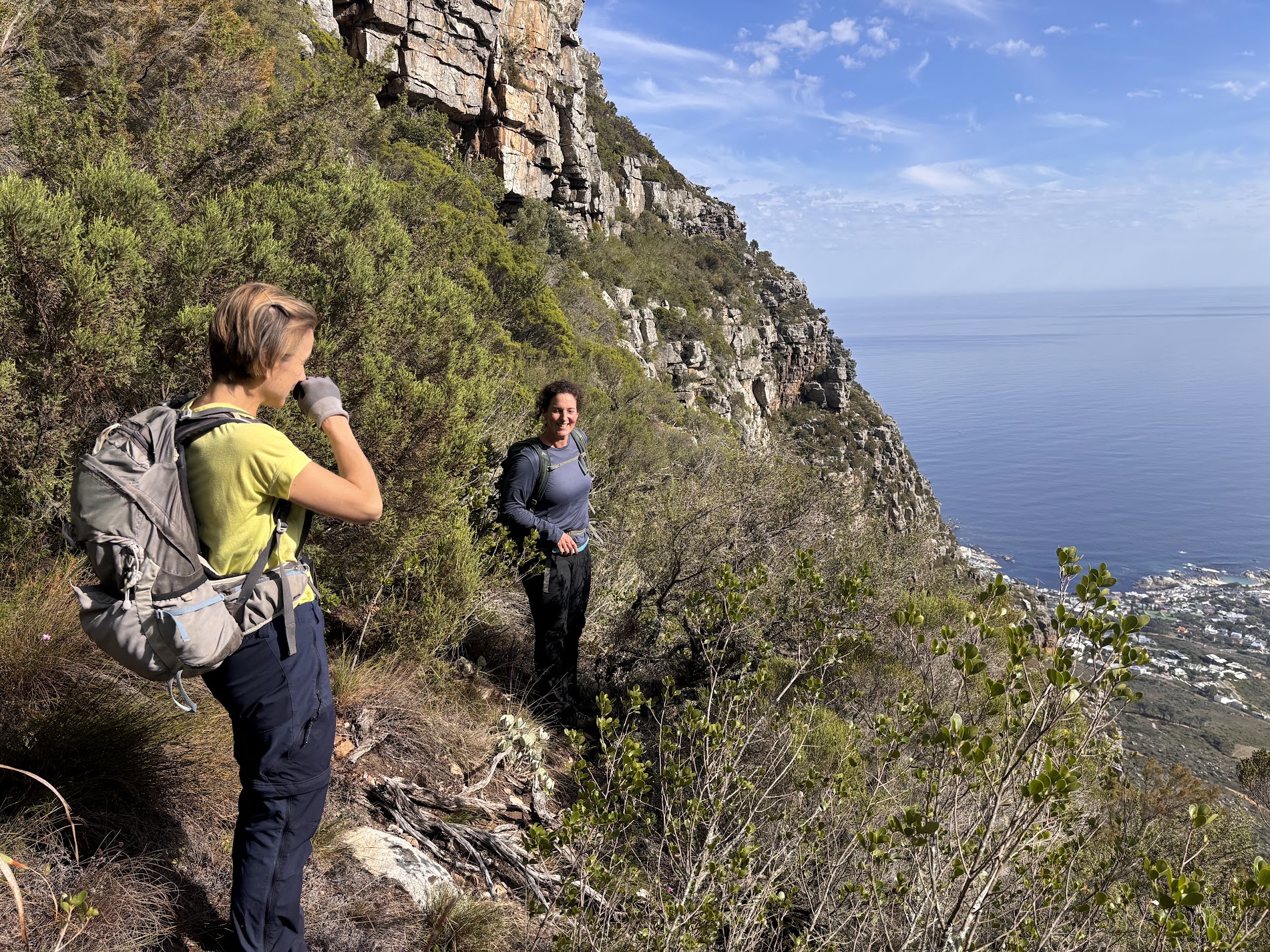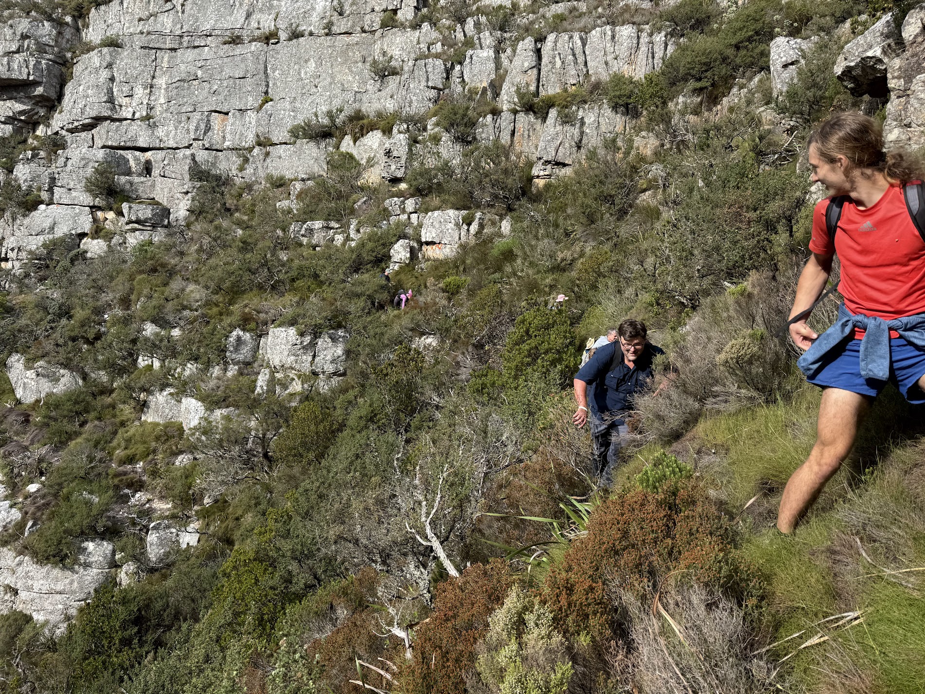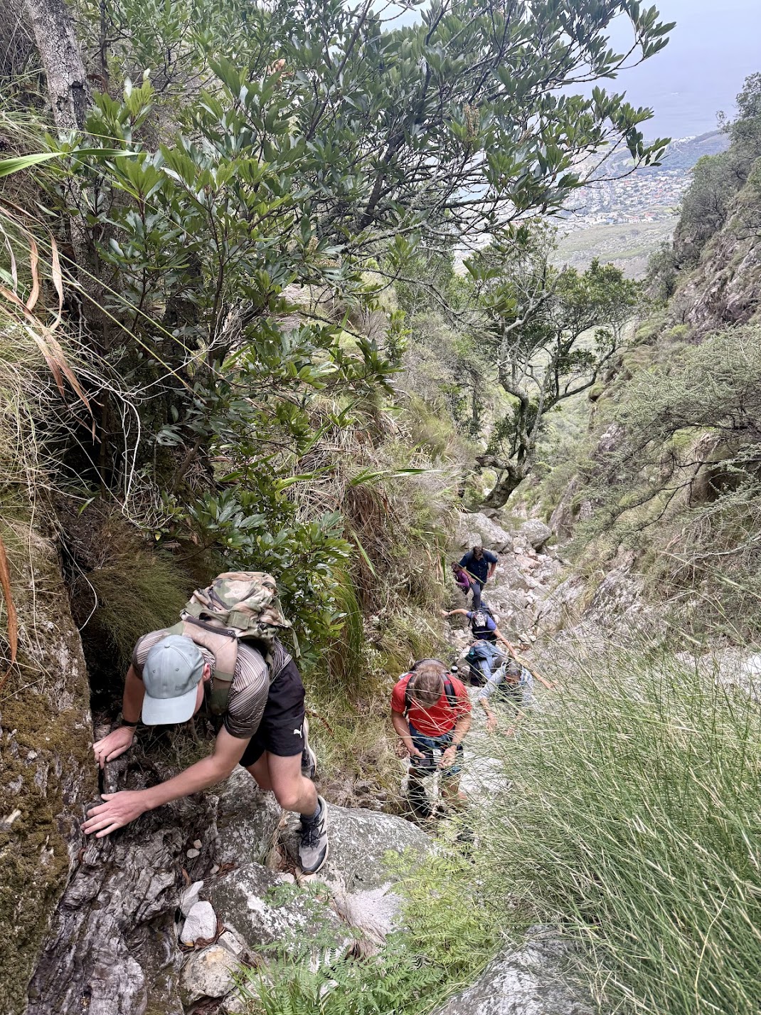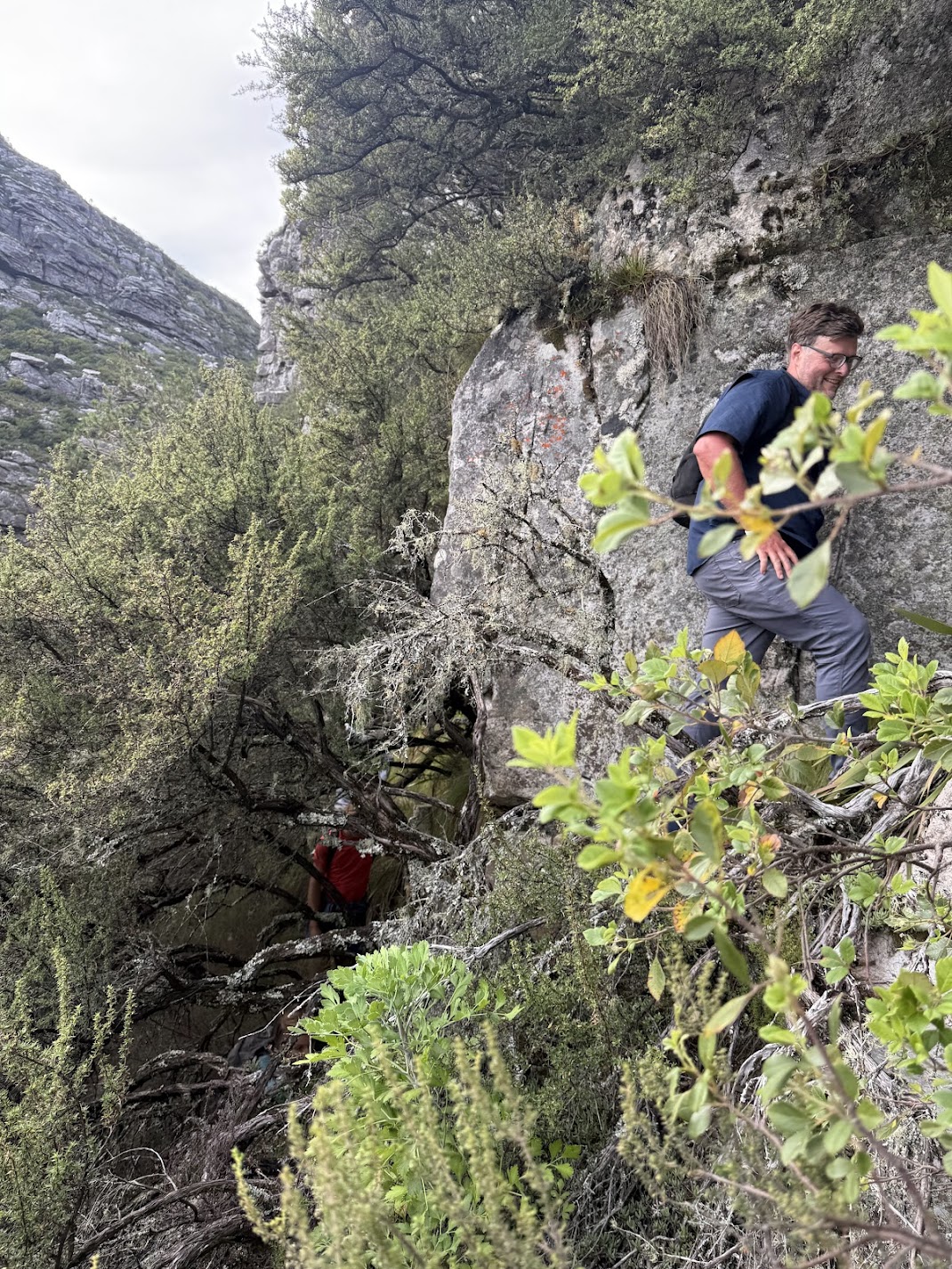 We quickly made our way up Blinkwater Ravine, and stopped for a tea-break on top of the chain section. With the area connecting Blinkwater Ravine and Blinkwater Needle in plain view, we discussed the two potential traverse lines leading to the other side. We opted for the upper faint path, which has become considerably more visible in recent time as more people seem to be walking it. However, we still had to bundu-bash and dive deep into vegetation for much of the section, which we really enjoyed.