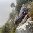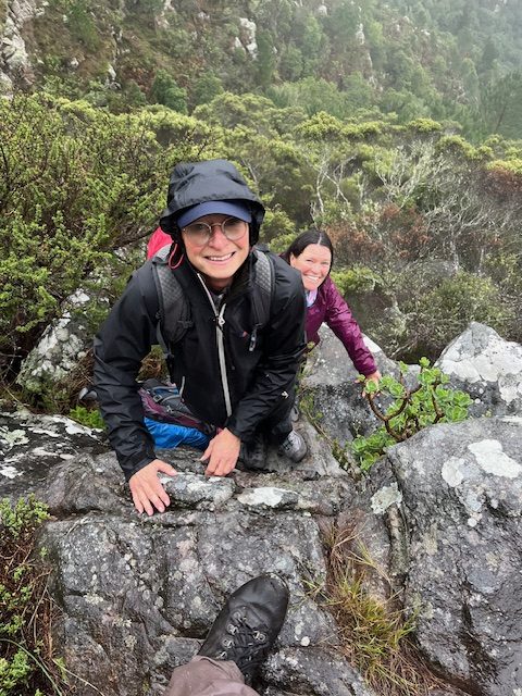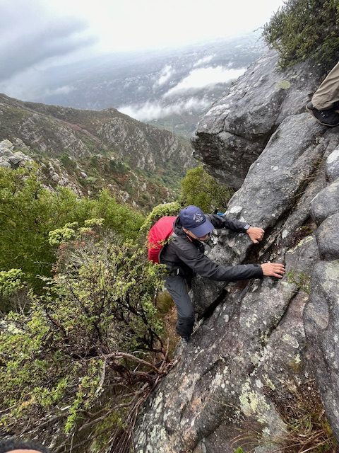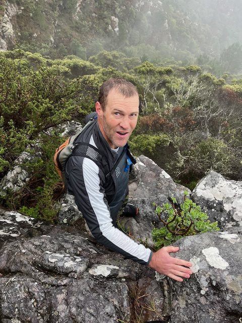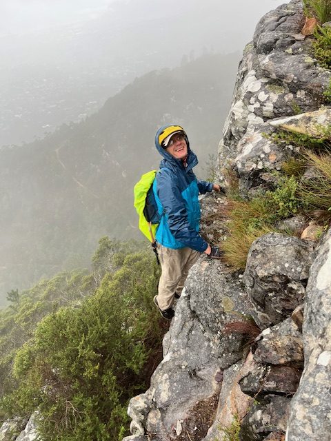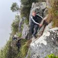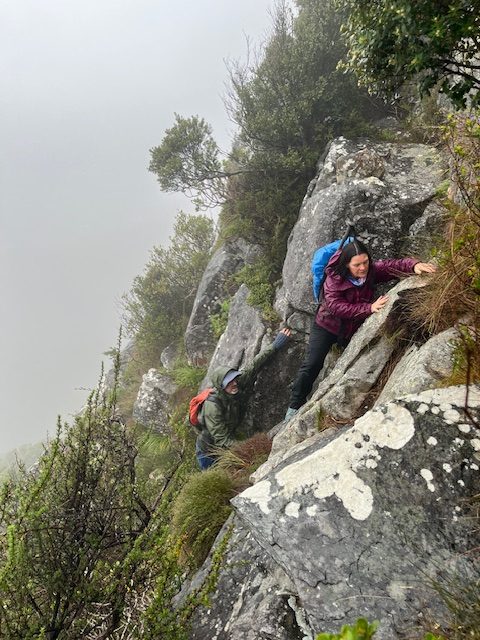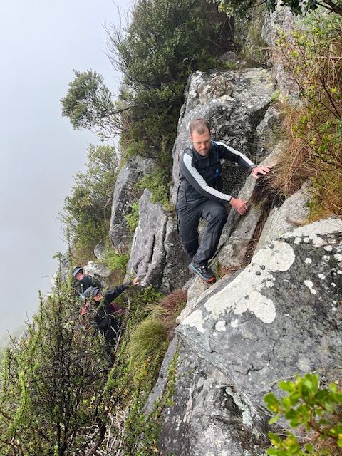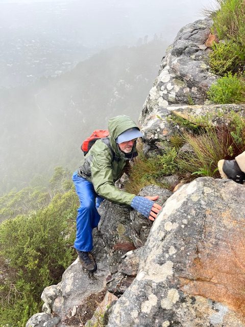 Ten of us set out from Cecilia carpark just after 08h00 in calm, cold and wet conditions. There were six cancellations prompted mainly by the rain. Whilst rainy, it was clear enough for us to see the ridge and most of the route up. One of the party retired on the approach path with a stomach ailment and then we were nine. A call was made at the start of the ridge scramble to proceed. All were keen and experienced scramblers although half of the group were initiates to Spilhaus. Everyone exercised extreme caution in the wet and managed the pitches comfortably with varying degrees of elegance. The cloud cover avoided our enjoying any shade during the beverage break which was kept short because of the cold. After completing the last pitch two more members chose to leave at the concrete road to avoid the onset of hypothermia exacerbated by insufficient gear. Then we were seven. The cold and wet discouraged the initiates posing in the Throne. After visiting Hole in the Wall we managed all the corridors except one which was considered too risky in the wet. The rain and cloud also precluded us enjoying the framed spectacle offered at the mandatory overhang. A small break in the cloud did however give us some glimpses down to Hout Bay from the path thereafter.