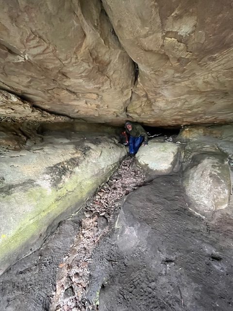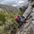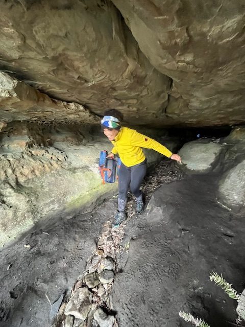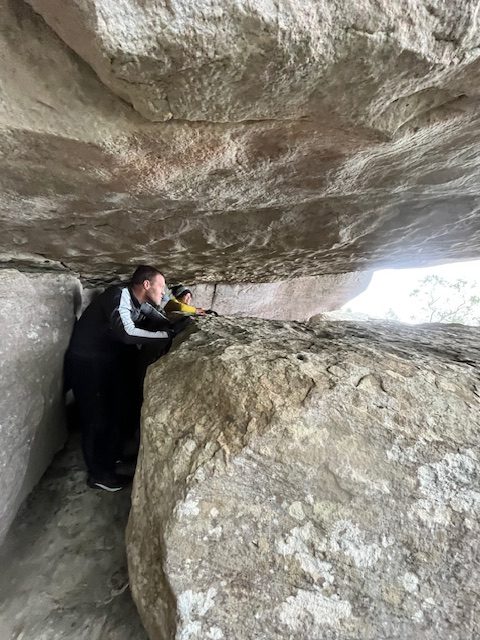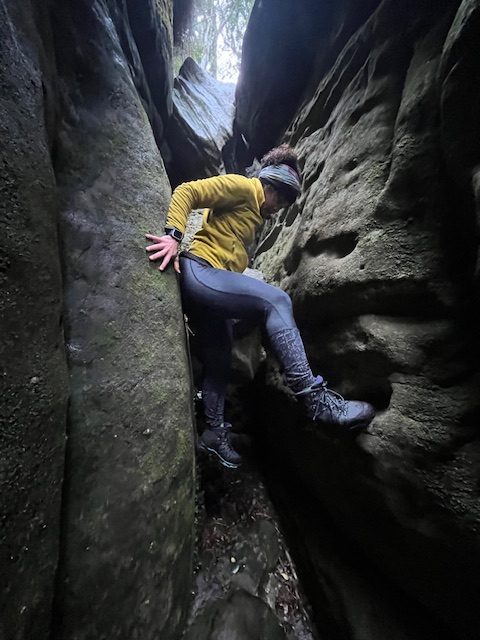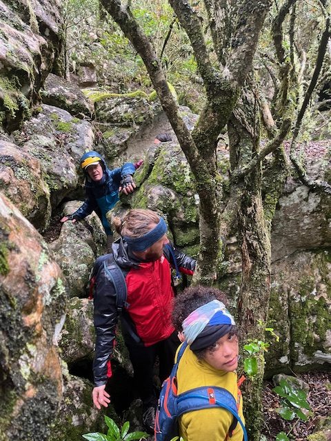 We all took the tunnel route which was somewhat damp in places, to our lunch venue. The low temperature and wet kept the break short but we were all energised by a member’s generous distribution of his excellent handmade kourabiedes. After lunch we exited through parts of the Enchanted Forest; a privileged treat in any weather. We did the Middle Earth loop which is always fun and all used the hole under the top rock when descending the chimney. On rejoining the road at De Villiers dam the youngest and fittest member ran down quickly as a leg stretch and then we were six. It was decided not to descend via Cecilia Ridge and with a brisk tailwind the principal fragment reached the cars at 14h48