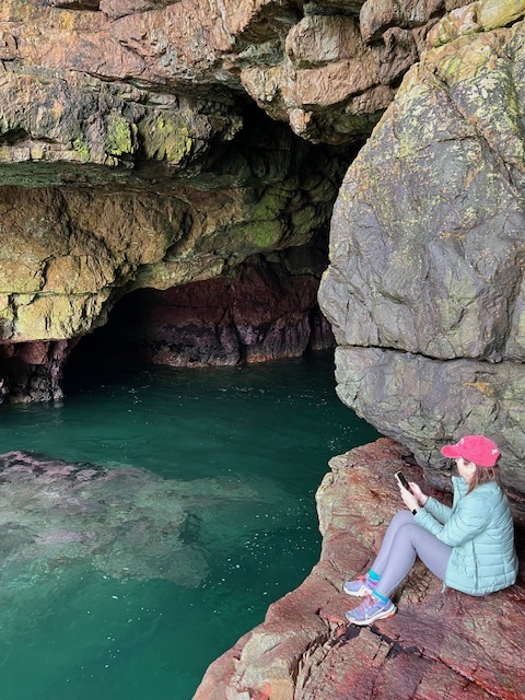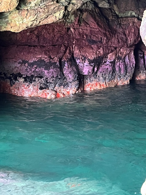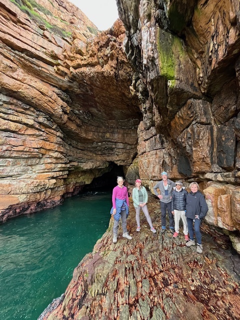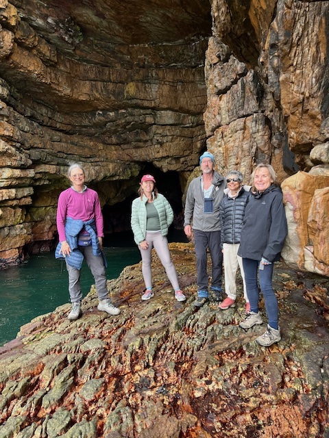 After meeting at the gate of the Cape Point section at 08h00 nine of us set out from the Rooikrans carpark around 08h35 for the descent to the ledges. The wind was gently from the SSW, nowhere near the predicted speed, and the sea was very calm. After checking the main ledge, we decided to visit the Cave and scrambled a short way up before traversing southwards. We then descended slowly and carefully on the awkward pitches. Three members chose to view the Cave from a few pitches up, with six of us making it safely to the bottom. It’s always an awe-inspiring experience to enter the Cave and especially so for the first time.