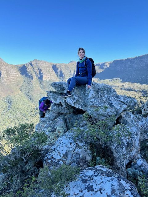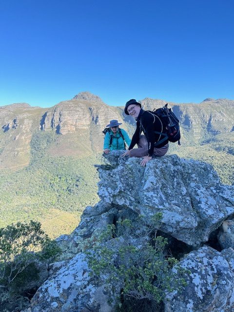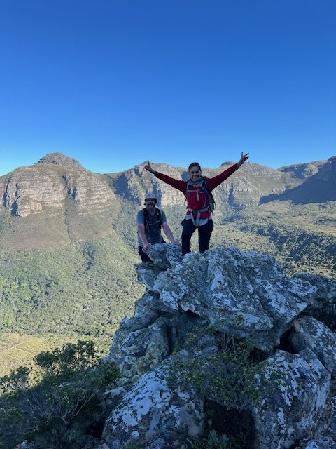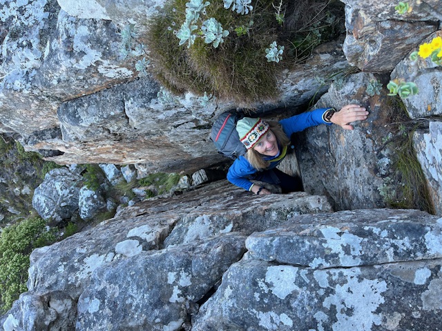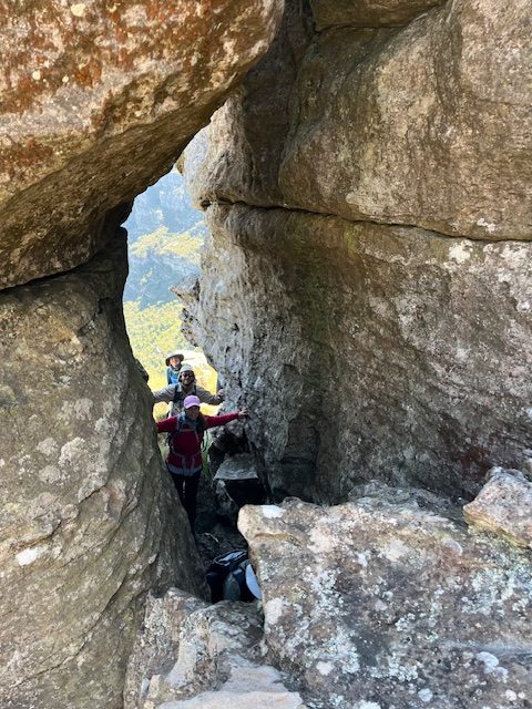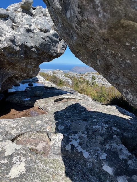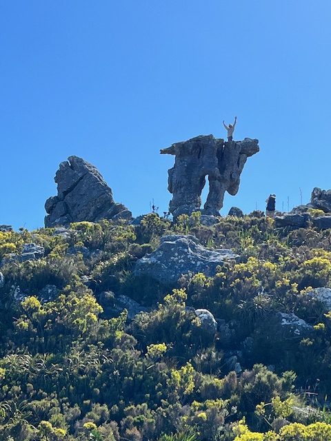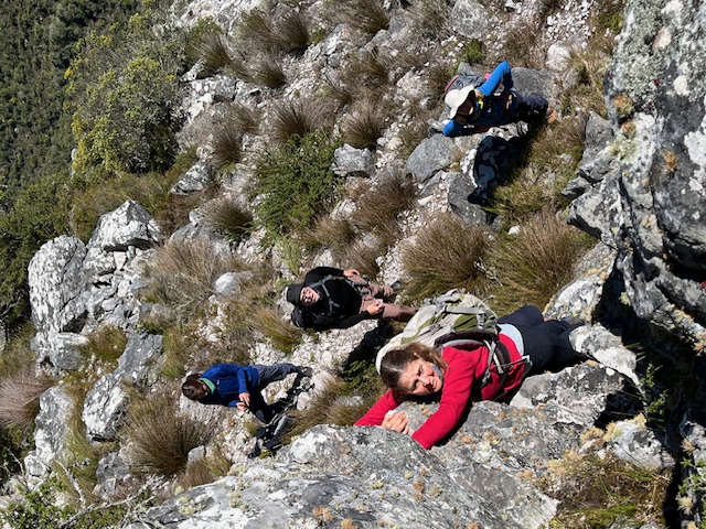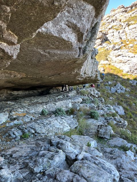 15 of us set out at 07h03 from Constantia Nek in ideal conditions, cool and breathless. This number included a member who very courteously joined us for a 30 minute meet and greet before having to leave. At the start of the Constantia Corner path we were treated to a pair of booted eagles appropriately circling above Eagles Nest. Traversing to the base of the Gully we had a pair of Southern Boubous duetting in the stillness. Everyone ascended using the Gully which was relatively dry and stable. Leaving the gully on its west side, we traversed to the first pitch stopping for the now usual geocaching discussion and the toilet demonstration. Everyone managed the pitches comfortably with some choosing to go round the chimneys. After the beverage break two initiates climbed the Camel enroute to Klaassen’s Kop.