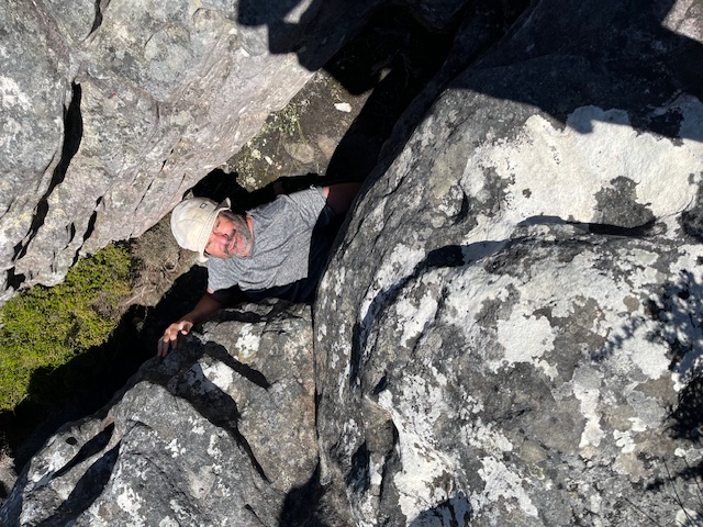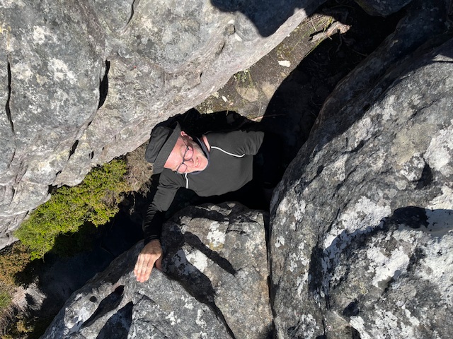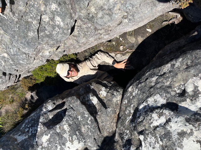 At Lumbago Alley most chose the hard way shuffling in a range of methods with varying degrees of elegance. We had a short break there to enjoy the view of the back of the Apostles and to fulfil the mandatory requirement of deciding which is Intake and which Frustration Ravine. We then ascended to the lunch spot below the top of Klaassen’s Kop enjoying the scrambles on the way up. The awkward pitch was done by most of the group as was the Postbox slot mini excursion before lunching on the warmer northern side. After lunch seven of us shimmied up the chockstone route to the summit, descending across the tree. We then regrouped at the lunch spot before heading across the top in an easterly direction to the Constantia Corner/De Villiers Dam path. We followed the path for a short while then detoured directly to the concrete road at the top of Spilhaus Ridge. The advance group of four reached the cars around 14h20 with the merged principal fragment of 10 arriving at 14h40