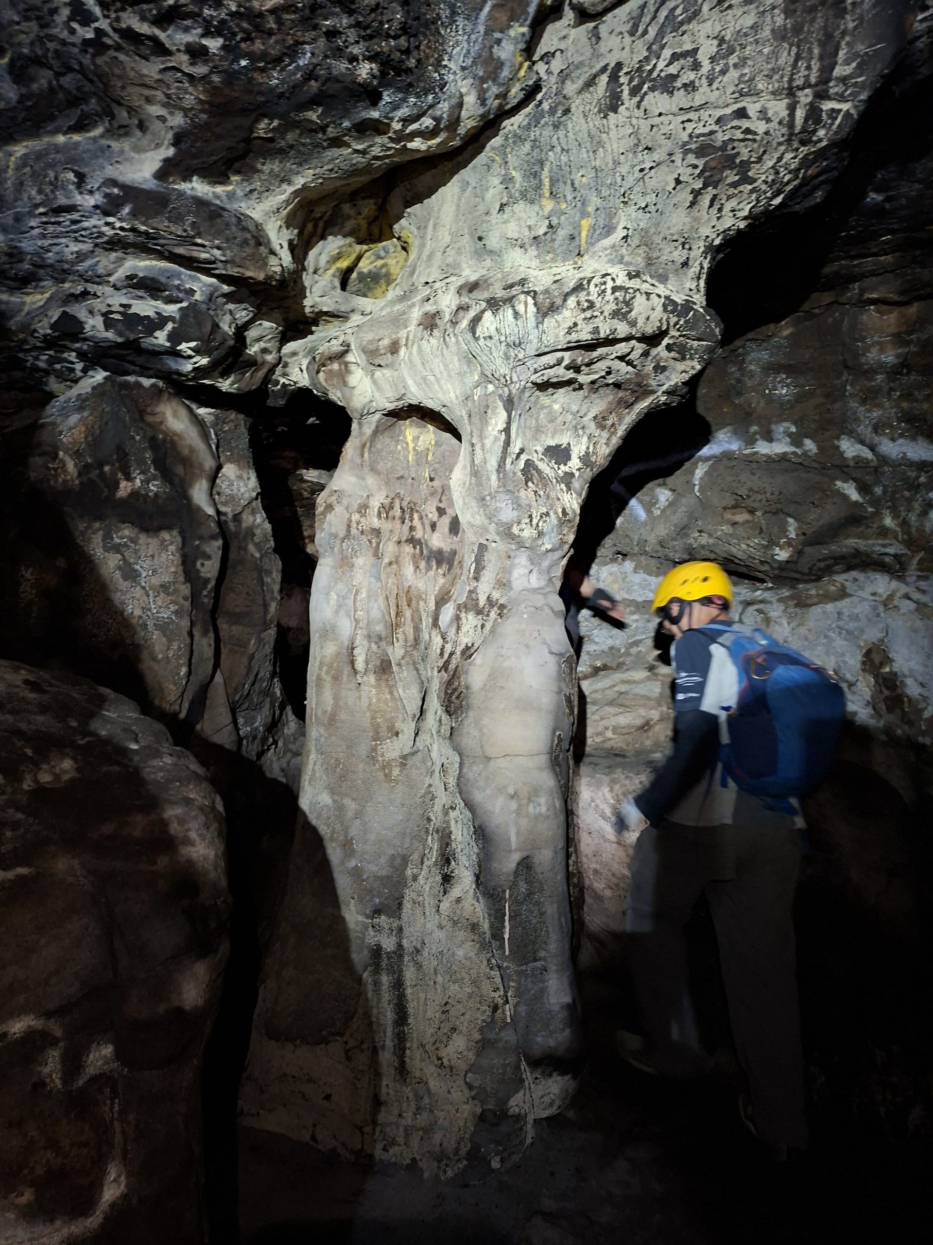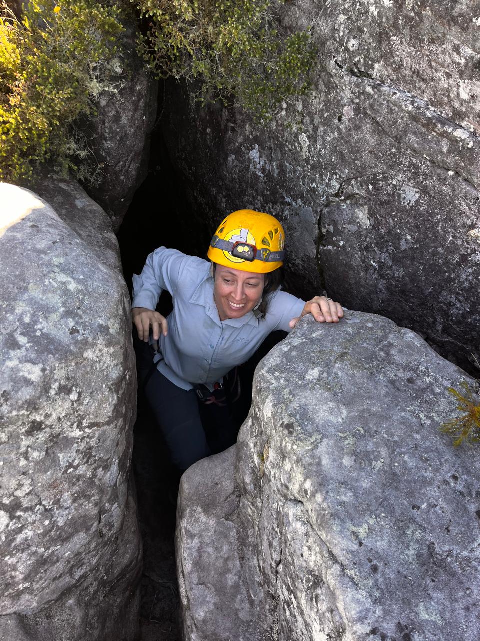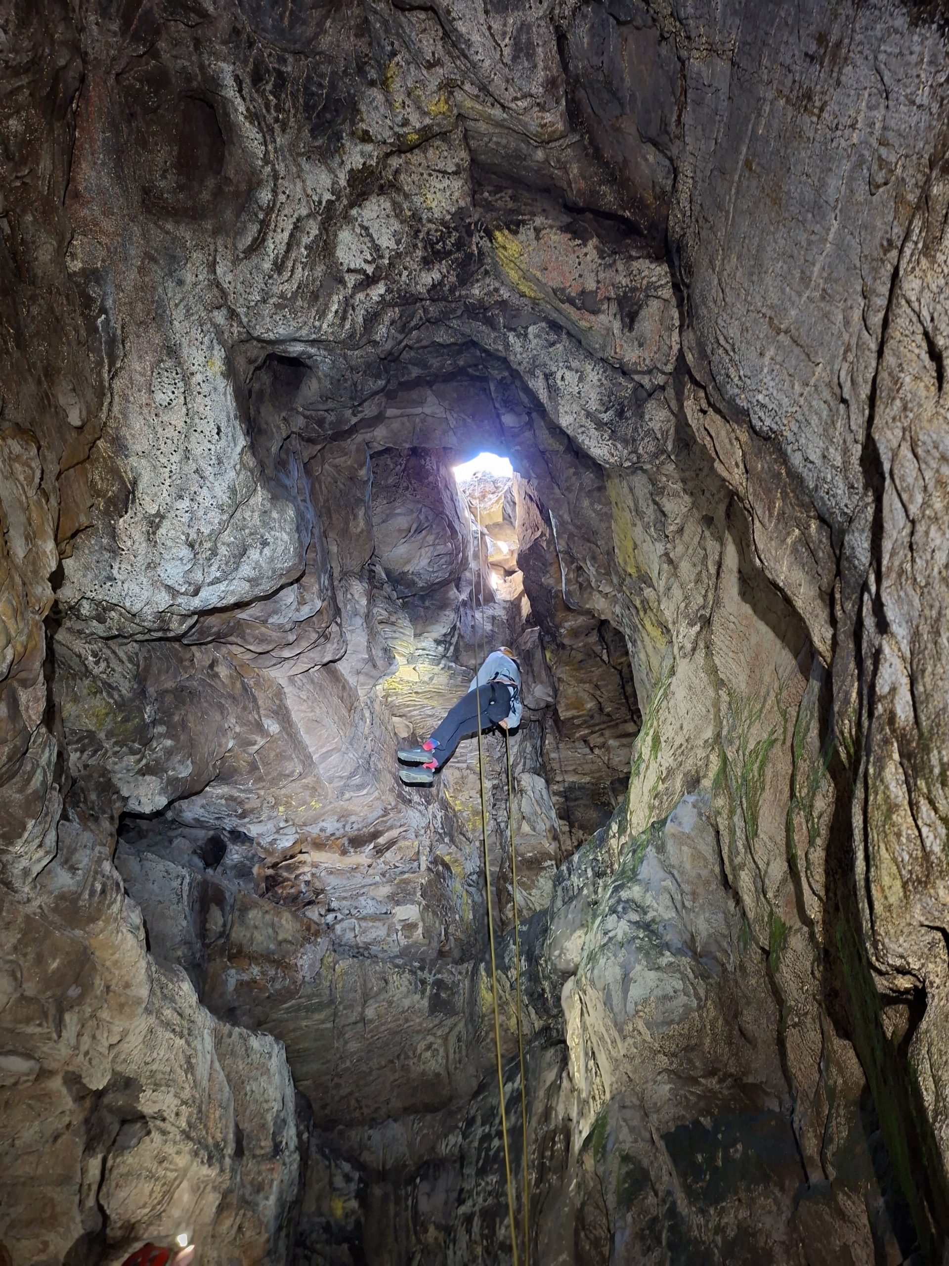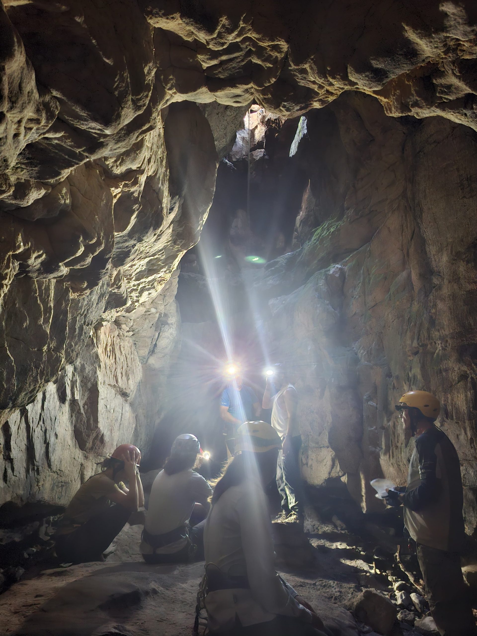 Excitement built as the passage out grew narrower and narrower, culminating in a small hole we had to squeeze through in the hope of seeing daylight again. We spent some time in Annie’s Hall, admiring the roots pushing through and the sparkling droplets clinging to the cave roof, before heading back above ground.
